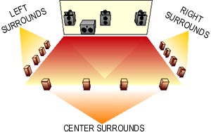 Dolby Digital–Surround EX 是 6.1 聲道,在數位訊號格式上完全相容舊有的 5.1 聲道,那麼是如何提供多出來的這個聲道?這個聲道又是要放置在哪裡?根據 Dolby 的說明,這多出來的聲道叫做 center surround,置放在觀賞者的正後方,如右圖(圖片取自 Dolby 網站)。根據 Dolby 的說明,這樣可以加深前後空間感。
