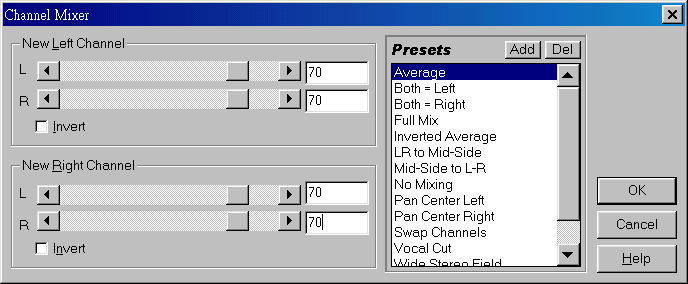 在畫面右邊有許多合併的預設方式,原本我使用 Averge,也就是左聲道的一半 + 右聲道的一半來組合,但做好後,與其他 wave 檔合奏時覺得中央聲道小聲了一點,所以後來我調整比例,也就是上圖那樣,各 70% 來混合,混合好的音量會大於原本單一聲道的音量,可是我覺得這樣在我的喇叭系統上比較均衡些。這並不是唯一的作法,您也可以先用 Averge 合併後,再用 Amplify 功能稍微放大。或是如果在您的系統上並沒有中央聲道比較小聲的問題的話,那當然是不用放大了。
