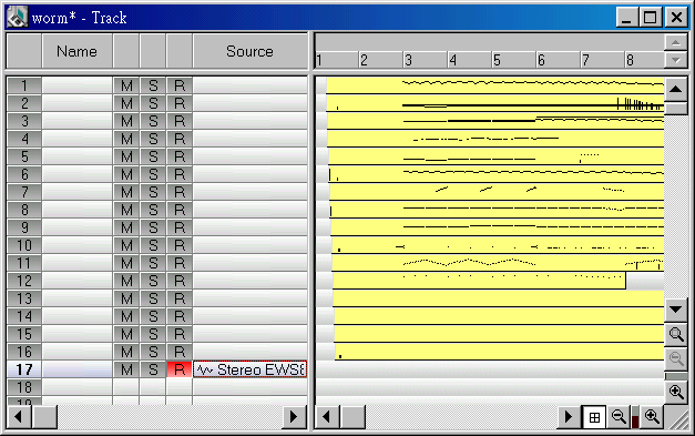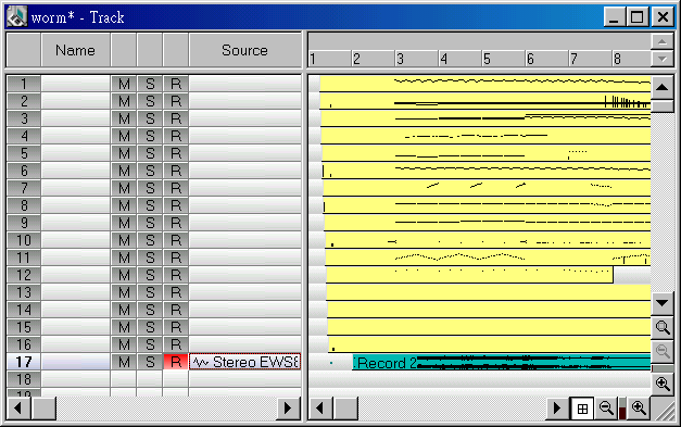 在修改 MIDI 檔的同時我發現了問題。在 WORM 中有好幾段的 tempo 變化,這些 tempo 變化原本在很精準的小節上執行,可是存檔後再取出,這些 tempo 值的執行點會有 offset(位移)產生。我研究了好久才發現這個問題,解決方法很簡單,不要存成 MID 檔就好,我原本就是用 Cakewalk,所以存成 WRK 檔就一點問題也沒有,不知道這是不是 Cakewalk Pro Audio 9 的 bug?這一點供大家參考看看。
