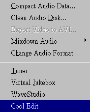 錄下來的 wave 資料要怎麼取出來?如果你有在系統上安裝 CoolEdit Pro/2000 或其他 wave 編輯程式(不知道是不是要 Cakewalk 登記有案的才會出現,至少 CoolEdit Pro/2000 在我這兒是會直接呼叫使用),那麼先點一下您剛才錄好的那個綠色 wave 資料長條,標記起來,然後從 Cakewalk 的 Tools 選單內點選 Cool Edit,如下圖: