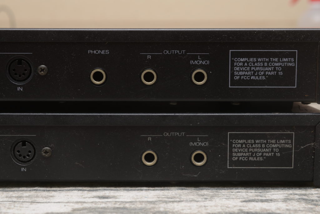根據國外大神 PhilsComputerLab 的 MT-32 終極教學介紹文,Roland MT-32 有新舊兩款,新款的背後會如同之後 CM-32L 的 CM 系列一樣,除了左右聲道外還有一個大 6.3mm 立體聲耳機孔,所以我這一台是舊的 Roland MT-32。此外根據他的介紹,舊款 MT-32 有遇到大量 MIDI message 會 buffer overflow 的問題,新款 MT-32 還內建了檢測模式與示範音樂,且新款 MT-32 的背景嘶嘶聲會更小。看到他講了這些,讓我對去找一台新款 MT-32 起了些興趣,這時候上 eBay 或者日本 Yahoo & Mercari 拍賣網站找到的 MT-32 都是跟我一樣的舊款,看來新款可能不好找喔!