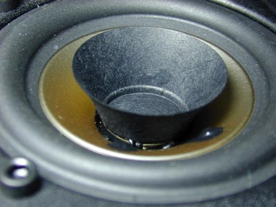 上圖是防塵罩拆下來的樣子。我們可以看到布網的處理十分乾淨。有些便宜的電腦喇叭,在這方面的處理就很粗糙,不拆下來還不知道,以為表裡如一,但是拆下來一看裡面就會發現殘破不堪的布網邊緣處理痕跡。這在 SP-60 上是沒有的,品管不錯。