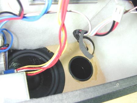 上圖是重低音箱內部,同樣襯有吸音棉。6.5 吋的單體是背對使用者的方向來發聲,並藉由上下兩個反射孔輻射出去(上圖無法看見底部的反射孔,詳見下段)。